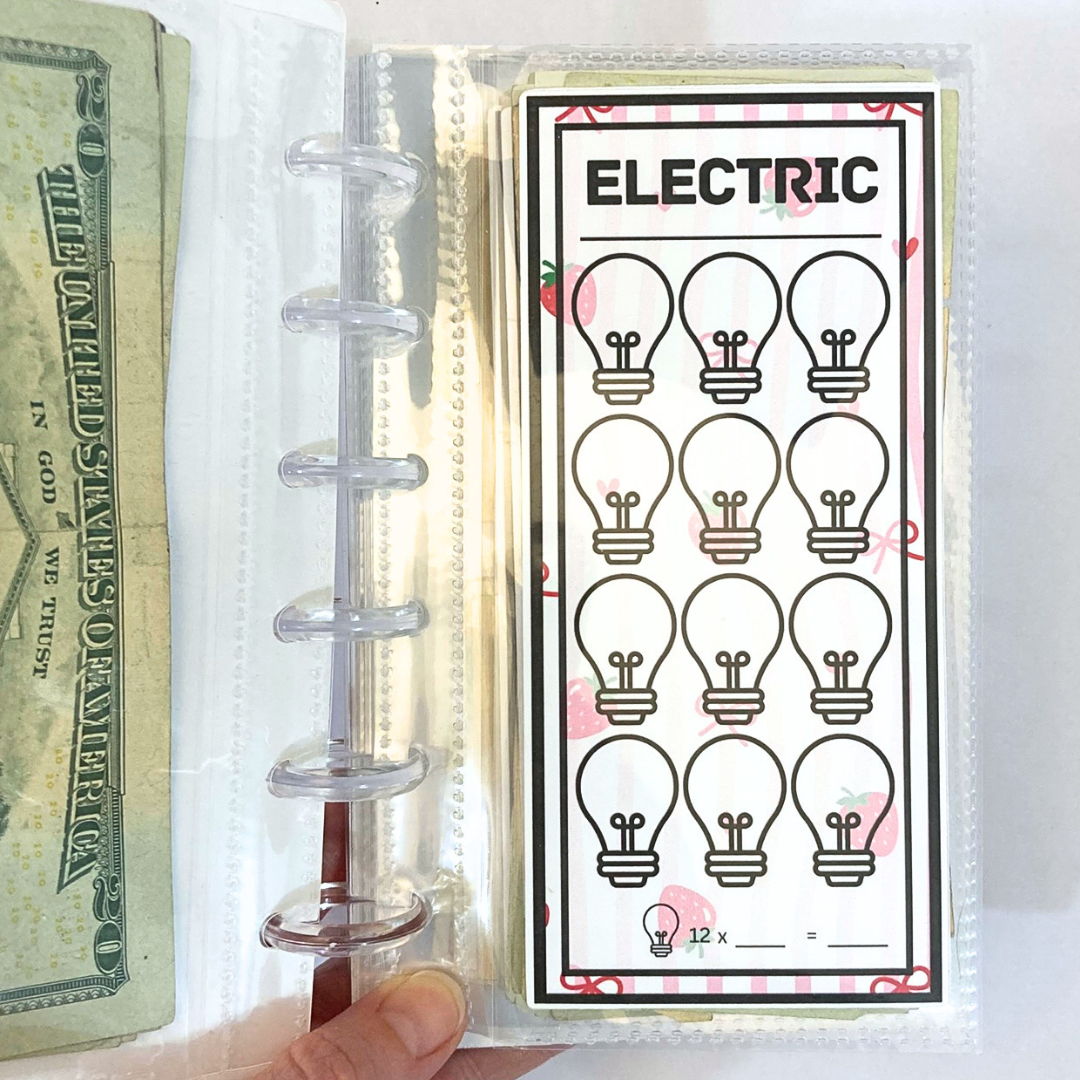 - 12 savings challenges: Housing, Electric, Groceries, Car, Phones, Subscriptions, Insurance, Bills, Emergency Savings Challenge, 1 Month Ahead Savings Challenge, $1 Savings Challenge, Monthly Challenge