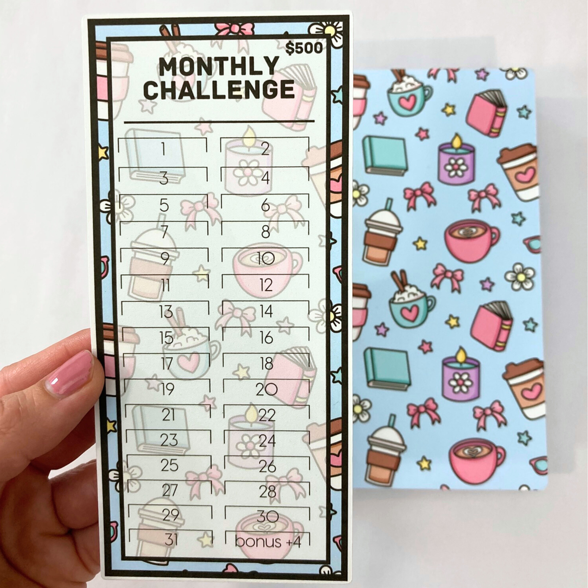 -3 challenge cards printed on 110lbs cardstock with 1 full sleeve (You only need 1 challenge card per month, the purchase comes with 2 extra so the binder can be used for 3 months total. Refill challenges can be purchased in addition to these 3.)
